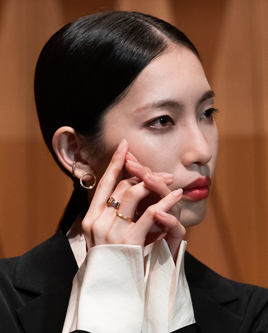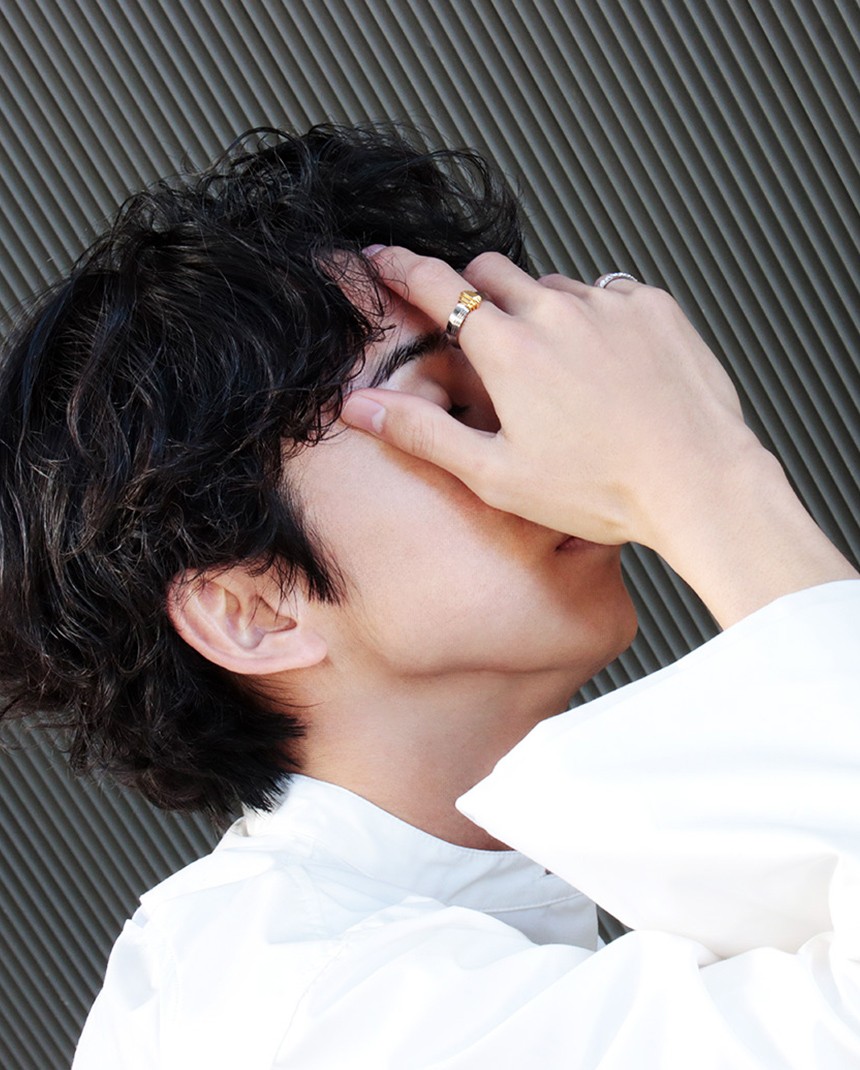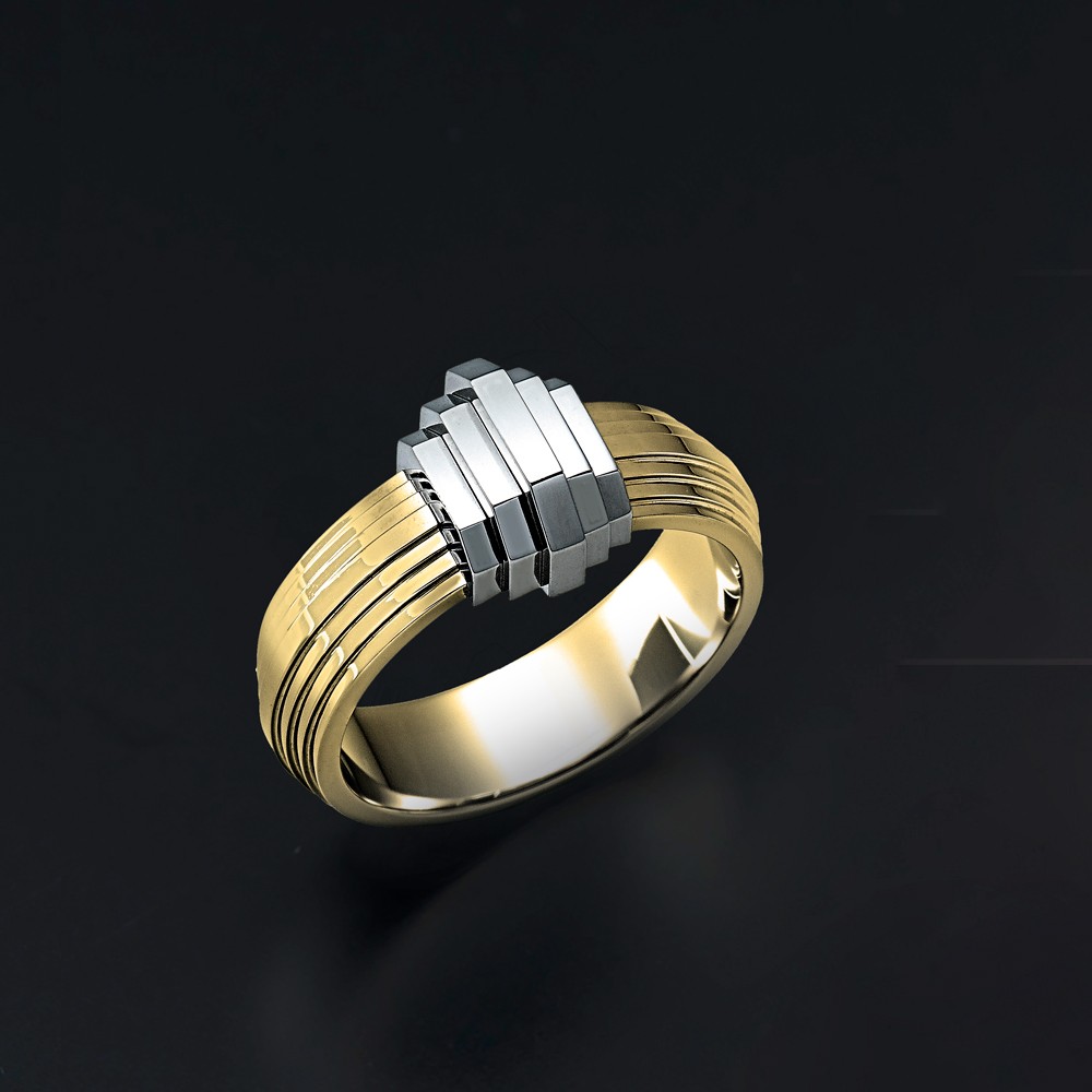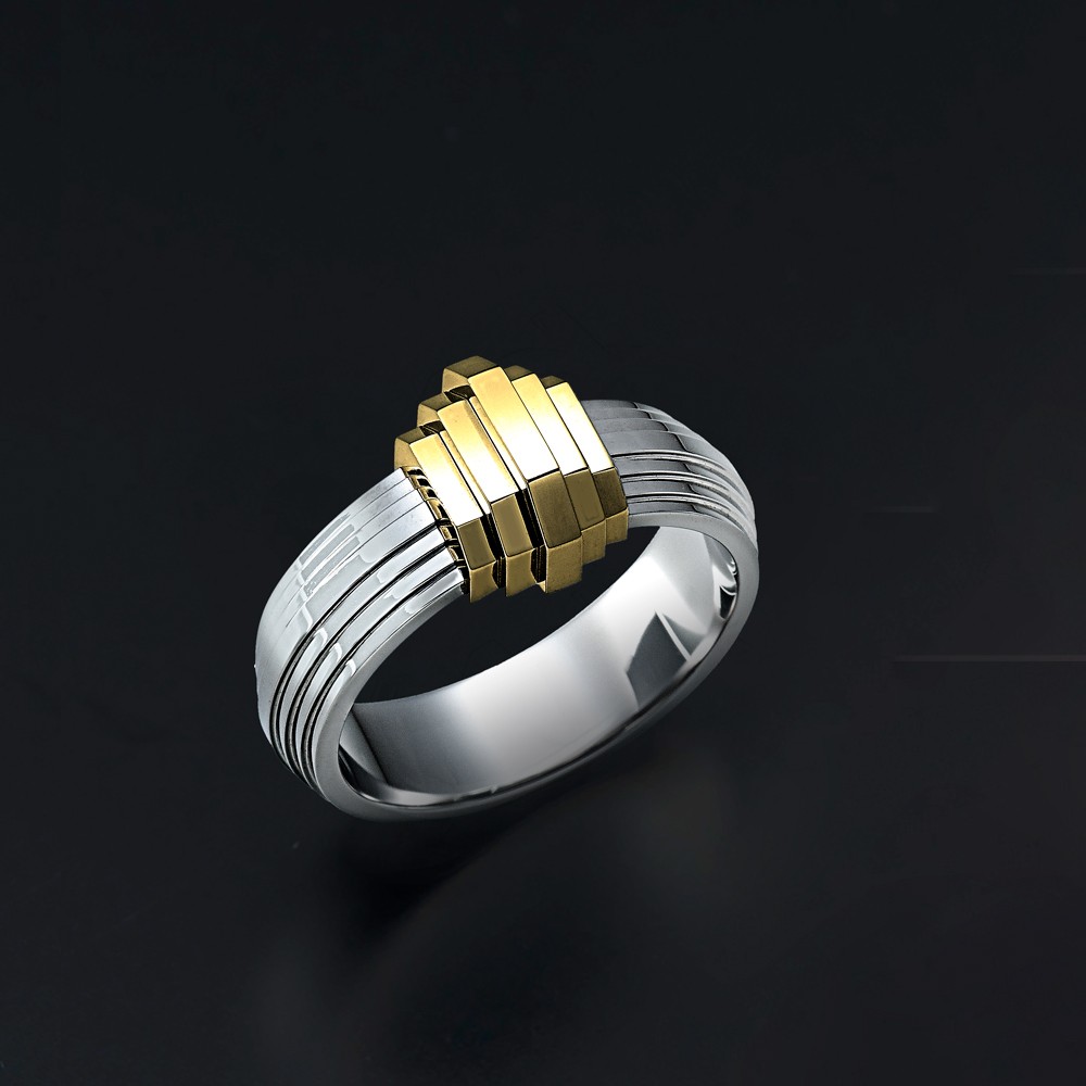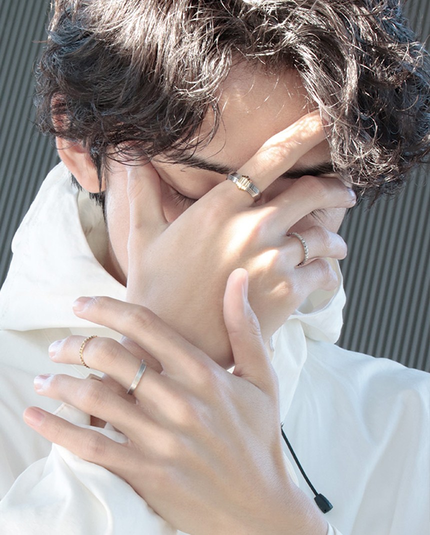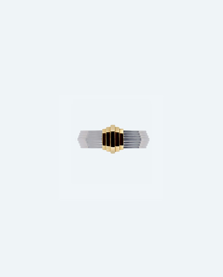 “カスケード”シリーズのカラーコンビネーション。イエローゴールドとプラチナのコンビネーションはシーンを選ばずに着けられます。直線、面、構築的でエッジの効いたフォルムから生まれる「光と影の演出」は、金属の素の質感が活かされた小さな建築物。1mm以下の段差に輝く面、重厚感は着ける人の感性を呼び覚まします。