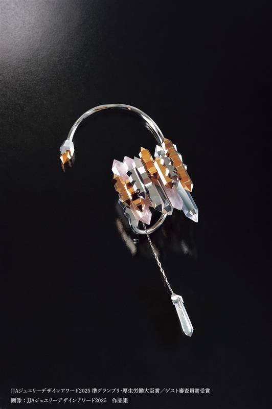 受賞作は、山梨県の名勝「鳴沢氷穴」の幻想的な氷の世界から着想を得た、 イヤーフックタイプのジュエリー《氷影 -HYOU-EI-》です。